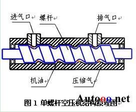 以單螺桿空壓機(jī)為例說明空氣壓縮機(jī)工作原理,如圖1所示為單螺桿空氣壓縮機(jī)的結(jié)構(gòu)原理圖。螺桿式空氣壓縮機(jī)的工作過程分為吸氣、密封及輸送、壓縮、排氣四個(gè)過程。當(dāng)螺桿在殼體內(nèi)轉(zhuǎn)動(dòng)時(shí),螺桿與殼體的齒溝相互嚙合,空氣由進(jìn)氣口吸入,同時(shí)也吸入機(jī)油,由于齒溝嚙合面轉(zhuǎn)動(dòng)將吸入的油氣密封并向排氣口輸送;在輸送過程中齒溝嚙合間隙逐漸變小,油氣受到壓縮;當(dāng)齒溝嚙合面旋轉(zhuǎn)至殼體排氣口時(shí),較高壓力的油氣混合氣體排出機(jī)體。