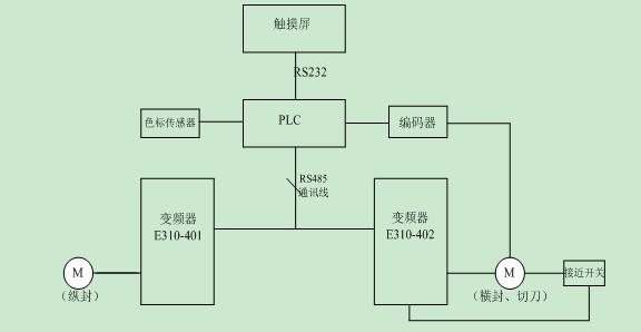 兩臺E310變頻器由一臺PLC通訊控制,縱封由一臺異步電機單獨拖動,橫封和切刀由另一臺異步電機拖動。正常運行時要求兩臺電機保持同步,主運行頻率由PLC給定,以保證袋長的精度。同時,薄膜標記傳感器不斷的在檢測薄膜標記(色標),機械部分的編碼器檢測主軸機械位置,上述兩種信號送至PLC,經(jīng)程序運算后,如果偏差超過允許值,則由PLC輸出段速信號給控制橫封和切刀的變頻器,段速的切換由接近開關(guān)控制,主軸每轉(zhuǎn)動一圈接近開關(guān)導(dǎo)通一次,導(dǎo)通時間占1/3,以時時調(diào)整橫封和切刀速度,補償偏差,從而把包裝袋長精確控制在一定范圍內(nèi)。檢測若在追蹤預(yù)定次數(shù)后仍不能達到技術(shù)要求,可自動停機待檢,避免廢品的產(chǎn)生。