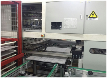 排版機把串焊機輸送過來的電池串(有正負極之分)按照設定好的正負順序進行取片、校正,然后放到按照設定的距離排到EVA覆膜后的玻璃上。